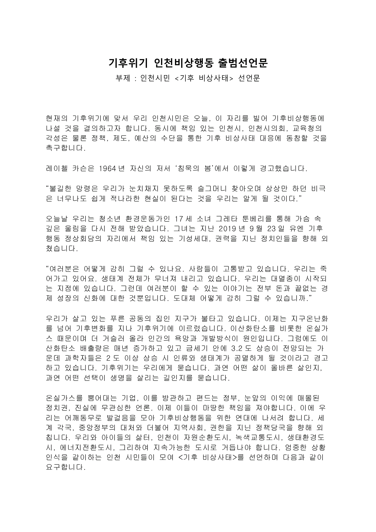 3. 인천시와 인천시의회는 시민과 함께 탄소 배출 제로 계획과 기후정의에 입각한 정책을 수립하고 그에 맞는 조직, 예산, 조례를 마련하라.